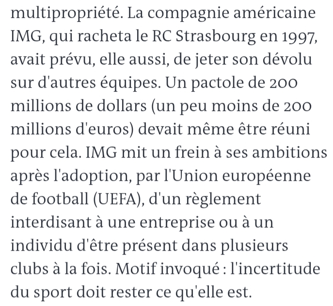 En octobre 2000, l’échec de la présidence de Proisy est évident et marqué notamment par des mauvais choix d’hommes et de stratégies. Arrivé à Strasbourg dans une logique de multipropriété, l’entreprise américaine ambitionnait de bâtir un réseau de clubs en Europe, suivant la première vague de ce modèle (Canal+ avec le PSG et Genève, Louis-Dreyfus avec l’OM et Liège, Berlusconi avec le Milan AC et Monza, Sensi avec la Roma et Nice, ENIC avec Tottenham, Athènes, Prague...). Mais la mobilisation de l’UEFA et l’Union européenne pour préserver l’indépendance des clubs met un coup d’arrêt à ces montages : le Racing devient alors un poids mort dans l’empire IMG McCormack.
