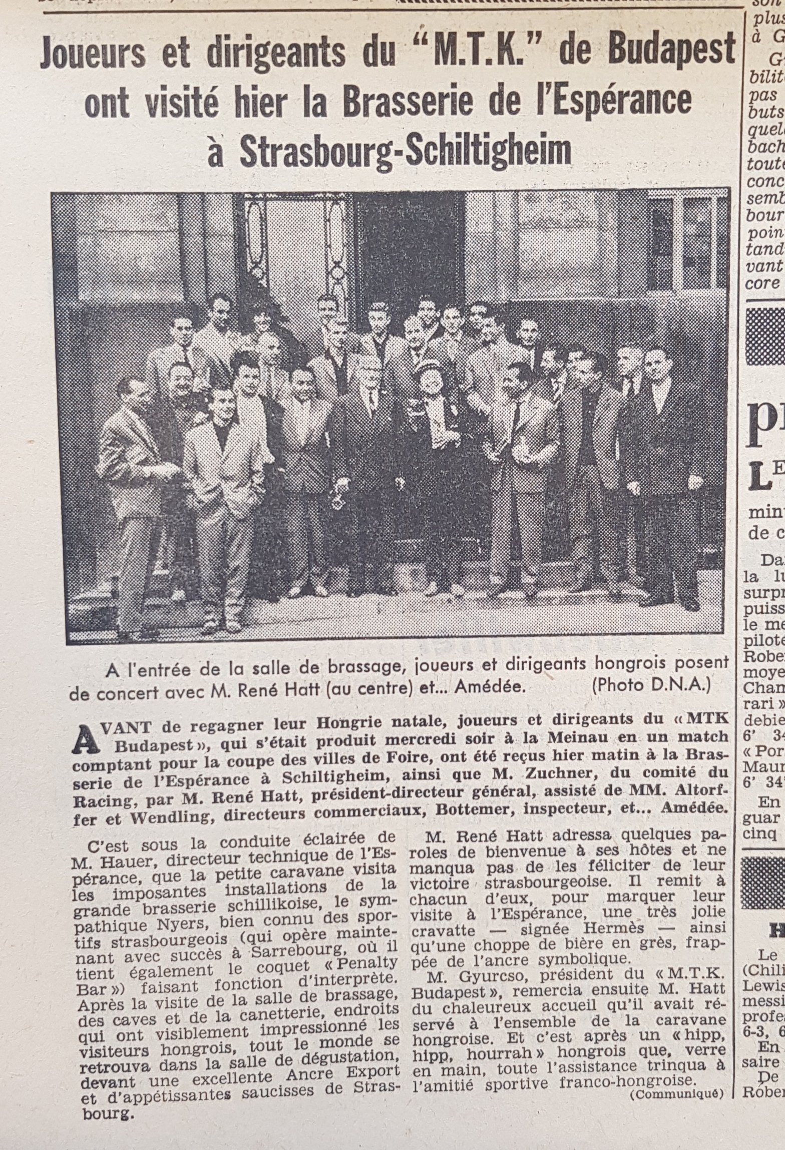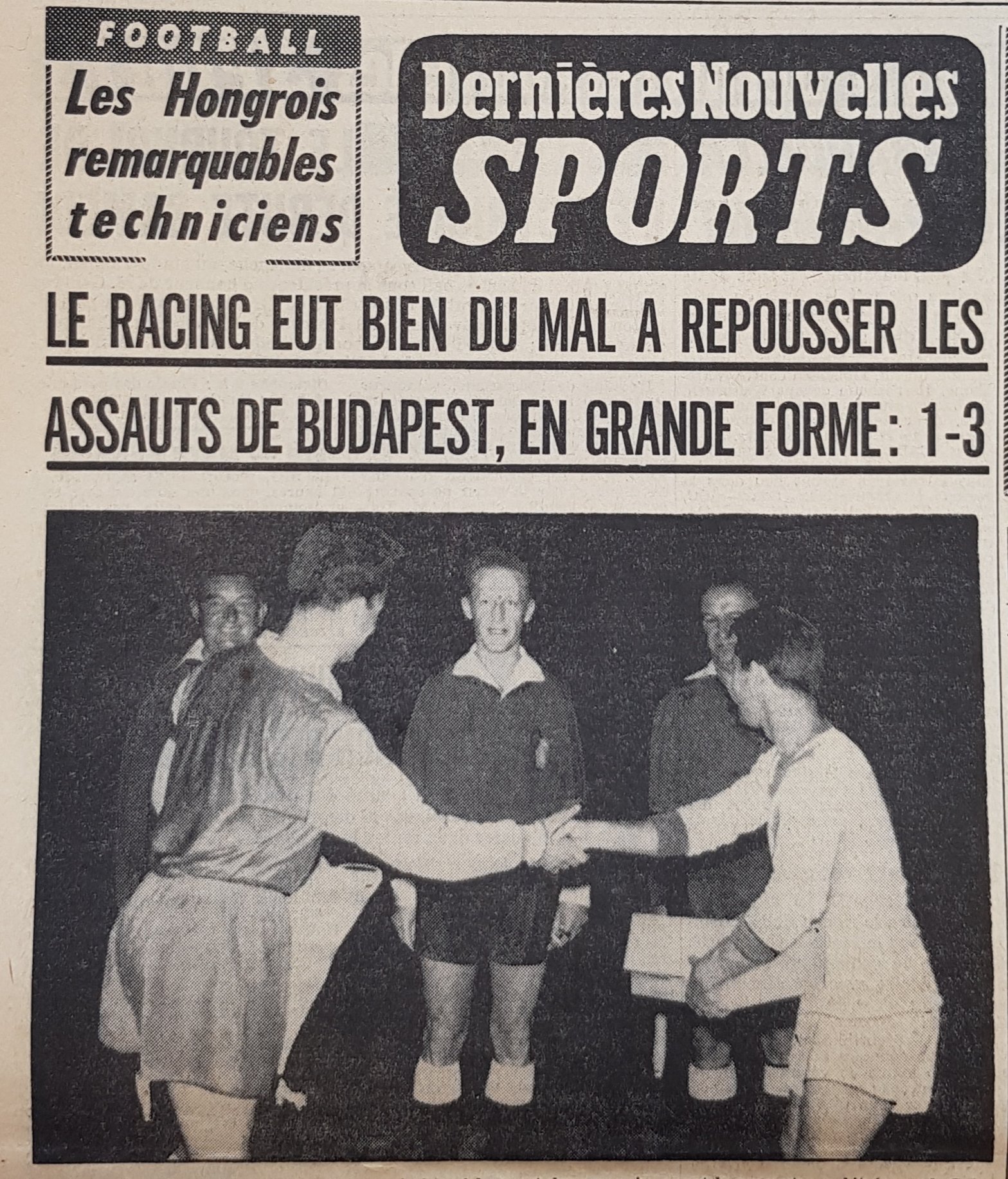 On retient tout de même qu’à la 73e minute, Jean-Michel Lachot a marqué, de la tête, le tout premier but européen du Racing. Le séjour des Budapestois se poursuit le lendemain à Schiltigheim, où bière, saucisses, chopes en grès et cravates-souvenir achèvent de marquer leur fructueux passage.