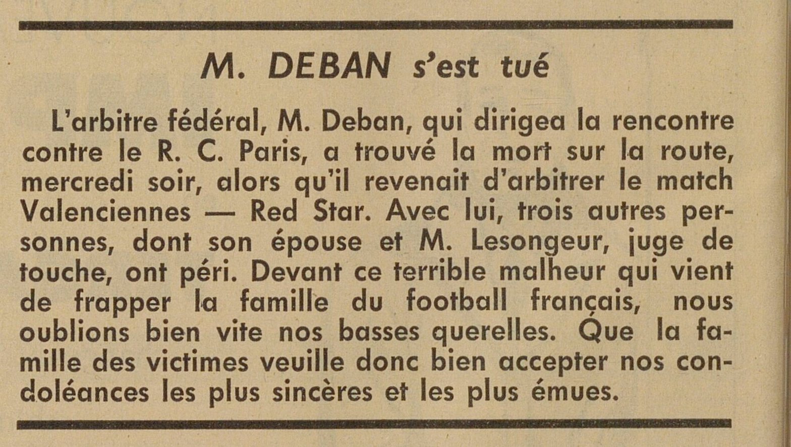 Le RC Paris gagne finalement 3-1, tandis que l’arbitre doit quitter le terrain en étant protégé par une double haie de policiers. Les DNA écrivent que M. Deban a « complètement gâché la grande fête automnale du football alsacien ». Tout en entretenant la polémique, le club appelle au calme pour éviter de nouveaux débordements. Un rebondissement inattendu va bientôt mettre fin tragiquement à la polémique…