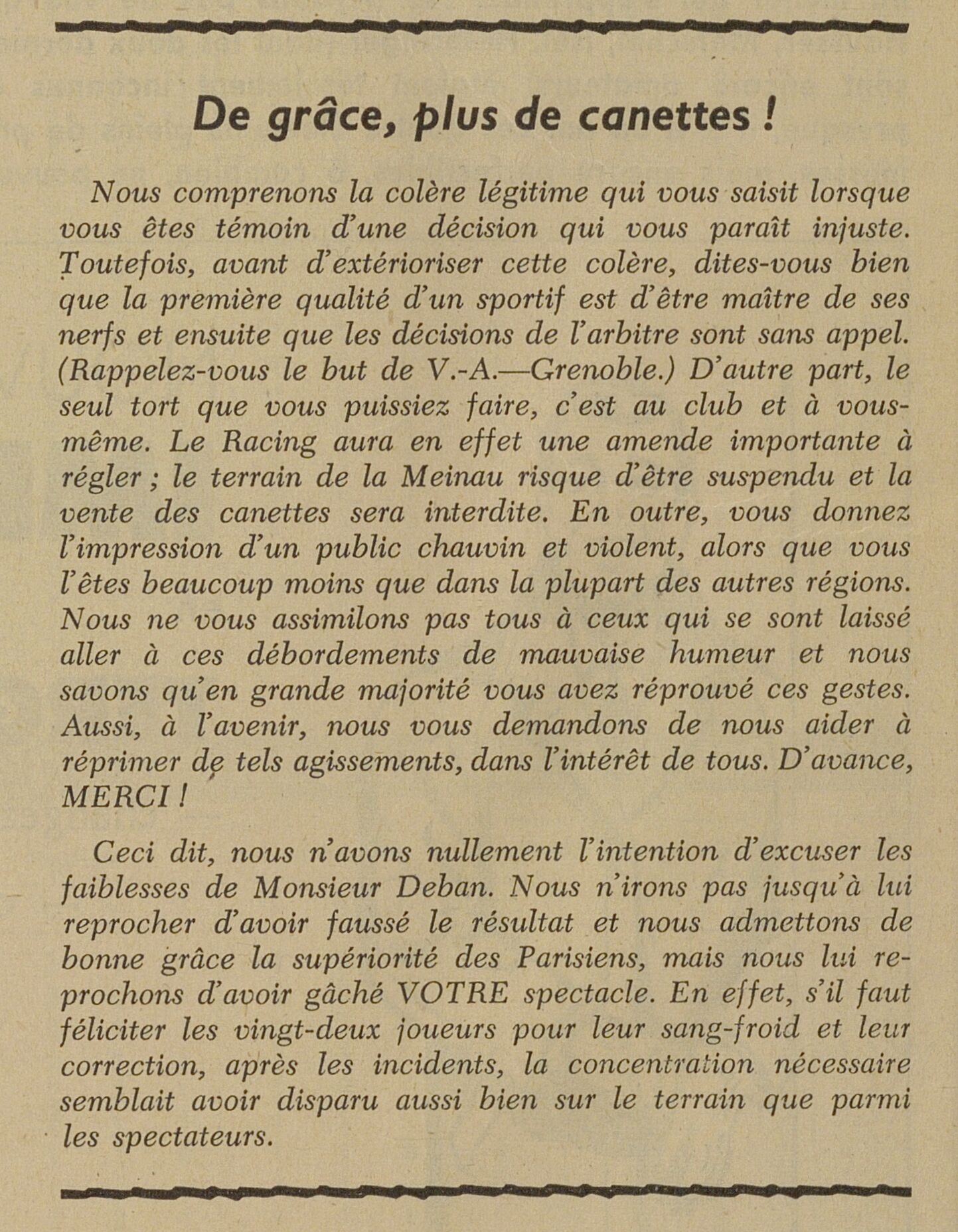 Mais avant cela, le Racing est sanctionné de 1000 francs par la ligue et un arrêté du Maire Pflimlin interdit la vente de bouteilles au stade.