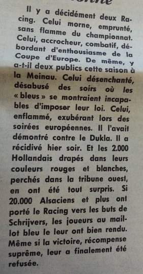 Le mécontentement des supporters est d’autant plus regrettable qu’au tour précédent, face au Dukla Prague, le Racing a bénéficié d’un soutien précieux, selon les propos confiés par Jean-Jacques Marx, un des joueurs de l’équipe :