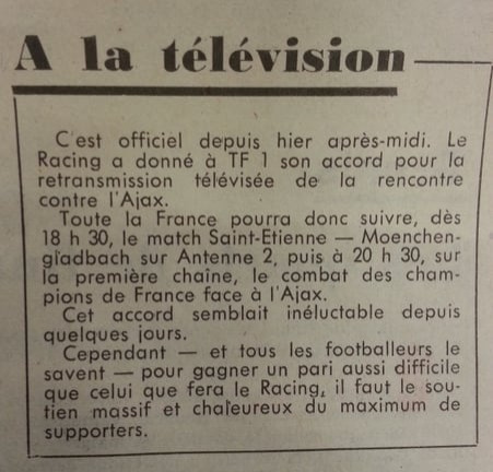 Dans l’urgence, le Racing distribue des milliers d’invitations pour remplir les tribunes, au grand agacement de ceux qui ont déjà payé leur billet. Finalement, pour ne pas renoncer aux indemnités proposées par TF1 et éviter de laisser aux seuls Verts le prestige d’une rare apparition télévisée, le club accepte la diffusion : lorsque la nouvelle paraît dans les DNA, les demandes de remboursement de billets se multiplient !