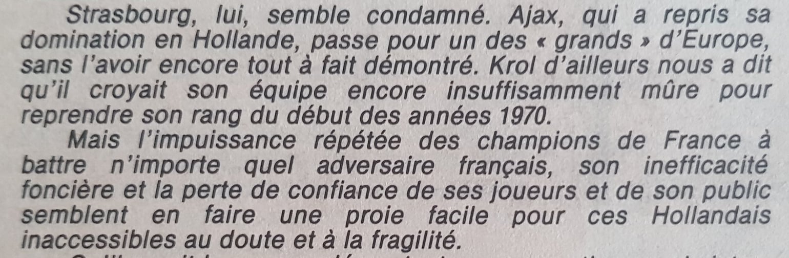 Mais déjà les signes avant-coureurs s’accumulent autour de ce match contre l’Ajax : Gress prolonge son contrat, mais pour une seule saison, à la surprise générale. La presse s’étonne aussi de l’absence inhabituelle du président Bord lors du match de championnat à la Meinau contre l’OM.