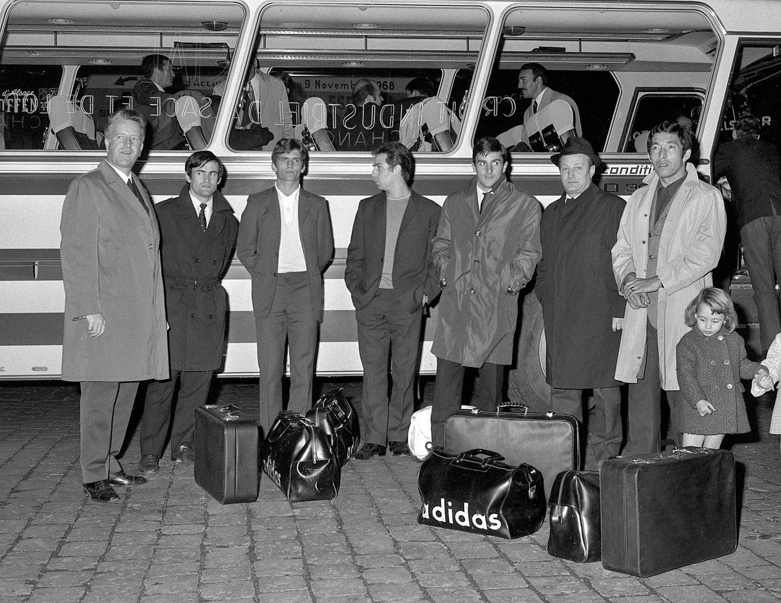 Sur cette photo, on reconnait notamment Henri Michel (3e en partant de la gauche) et Jean Djorkaeff (7e), à leur arrivée à Strasbourg.